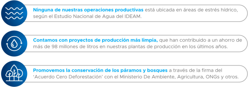 Entendimos a tiempo que el agua es el recurso más importante del planeta, siendo vital para la vida humana y las diferentes especies que lo habitan. Por eso, convertimos en una prioridad garantizar un desarrollo sostenible en el cual el agua esté disponible en calidad y cantidad, implementando iniciativas que nos permiten ahorrar, tratar y reusar el agua, contribuyendo a la reducción de nuestra huella hídrica.